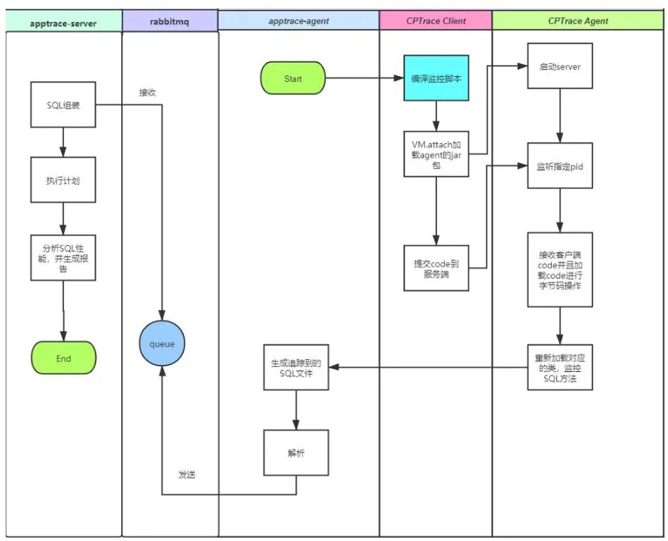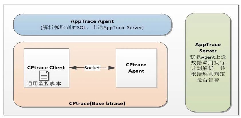 - AppTraceAgent组件:该组件用于将CPTrace抓取到的SQL进行解析,并通讯至AppTrace Server供其进行分析(采用MQ进行数据传输)。