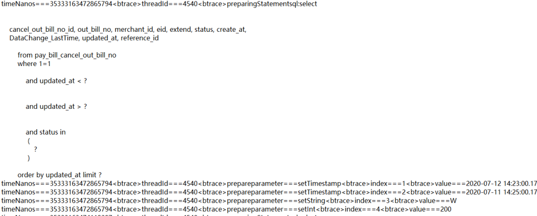 将Btrace脚本编译成字节码文件,执行命令btrace <pid>btrace脚本,Attach API把代理包动态附加到待监控的JVM上去,通过代理包解析SQL Java 脚本。使用ASM(Java字节码操作和分析框架)修改类java.sql.Connection,java.sql.PreparedStatement,利用 JDK Instrumentation动态替换类,最后将追踪到的SQL以及参数记录到sqltrace.txt文件中,追踪的SQL如下: