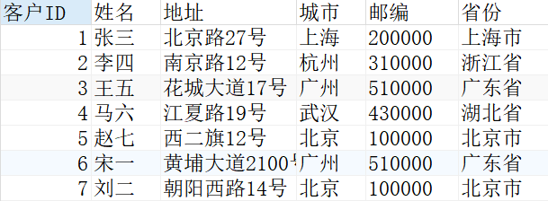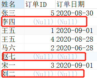 我们发现刘二,李四,赵七没有对应的订单ID和订单日期,是因为他们没有在订单表Orders中存在,没有匹配上他们的信息。但是由于是左连接,就把主表Customers的信息全部显示出来了,就是对应上图的table1。