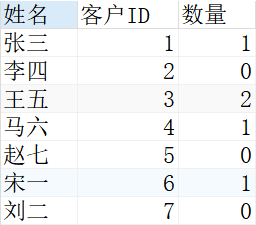 SELECT `姓名`,`客户ID`,(SELECT COUNT(*)FROM orders oWHERE o.`客户ID`=c.`客户ID` ) AS '数量'FROM customers c