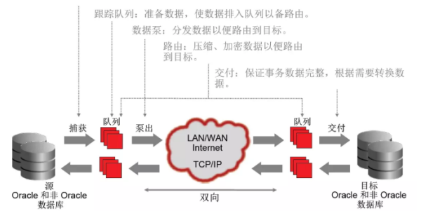 a、源端使用了本地trail文件,Pump进程把trail以数据块的形式通过tcp/ip协议发送到目标端,这也是通常推荐的方式。