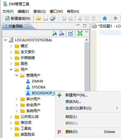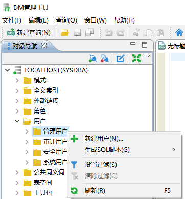 步骤1:启动DM管理工具,使用DBA角色的用户连接数据库,如SYSDBA用户。登录数据库成功后,点击用户,右键点击对象导航窗体中的管理用户,选择新建用户,弹出如图2-1。