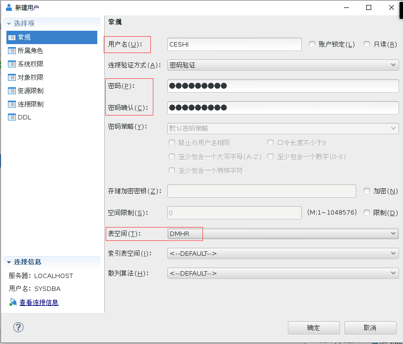 创建一个CESHI用户,用户属于DMHR表空间,CESHI用户拥有创建表、索引的权限。