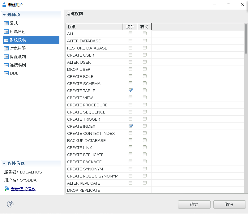 步骤3:点击系统权限,选中CREATE TABLE和CREATE INDEX,如图2-3。