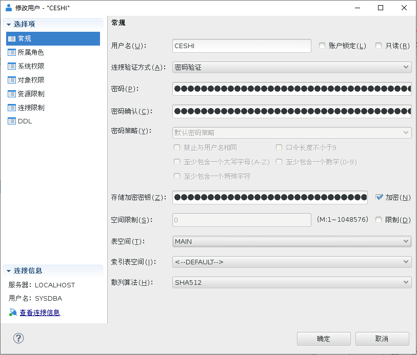 存储表空间:该用户对应模式对象存储的位置,如果没有指定表空间,该用户对应的模式对象将会存储到MAIN表空间中。
