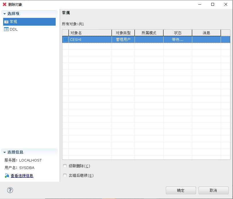 步骤1:启动DM管理工具,使用DBA角色的用户连接数据库,如SYSDBA用户。登录数据库成功后,点击用户,打开管理用户,选中用户CESHI,右键弹出菜单如图3-1,点击删除。选中用户CESHI,点击删除,如图3-4。
