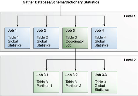 下图说明了在不同级别上作业的创建,其中表3是一个分区表,而其他表是未分区的。作业3充当表3的协调器作业,并为该表中的每个分区创建一个作业,并为表3的全局统计信息创建一个单独的作业。如果启用,则在分区作业完成后,数据库将从分区级统计信息中获取全局统计信息。