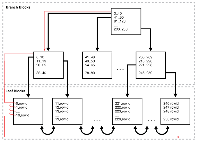 然后,数据库到达一个叶块,扫描按索引顺序遍历索引的底部,一次跨一个块。数据库使用单块I / O而不是多块I / O。