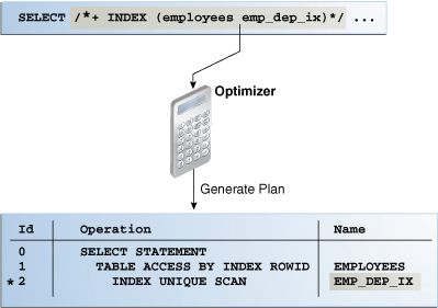 您可以使用提示来影响优化器模式,查询转换,访问路径,联接顺序和联接方法。在测试环境中,提示对于测试特定访问路径的性能很有用。例如,您可能知道索引对于某些查询更具选择性,从而导致更好的计划。下图显示了如何使用提示来告诉优化器为特定的语句使用特定的索引。