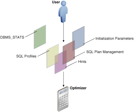 上图中的正方形重叠表示SQL计划管理同时使用了初始化参数和提示。SQL配置文件从技术上还包括提示。