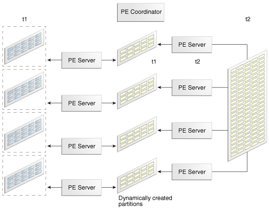 由于t2未分区,因此一组并行执行服务器必须t2根据需要从中生成分区。然后,一组不同的并行执行服务器将这些t1分区连接到动态生成的分区。并行执行协调器将结果组合在一起。