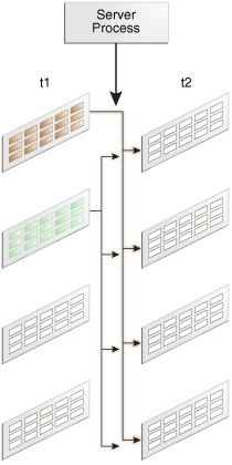 下图显示了并行执行的完整分区连接。在这种情况下,并行性是一个分区。每个并行执行服务器均成对加入分区。例如,第一并行执行服务器将的第一个分区加入的第t1一个分区t2。然后,并行执行协调器将结果组合起来。