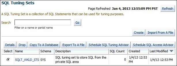 的SQL调整集页面Cloud Control中的SQL调整集页面是您可以从其中执行与SQL调整集有关的大多数操作的起始页面。 - SQL优化集