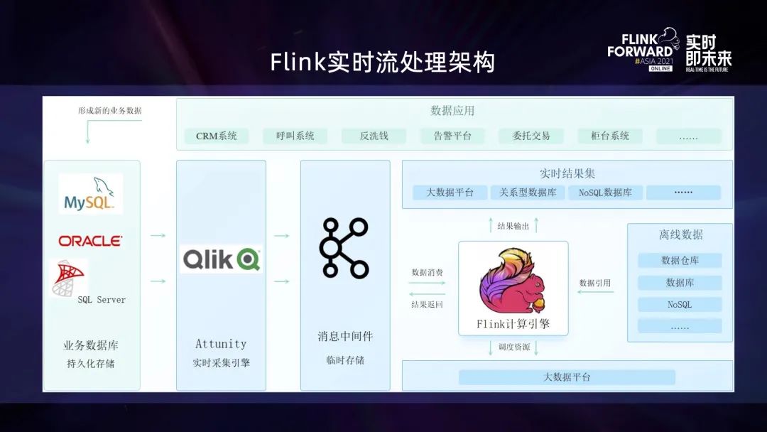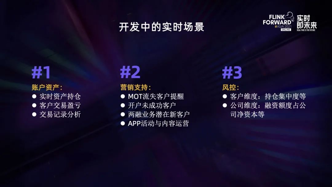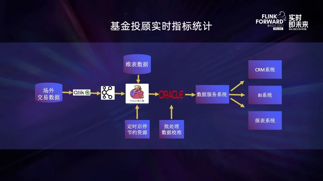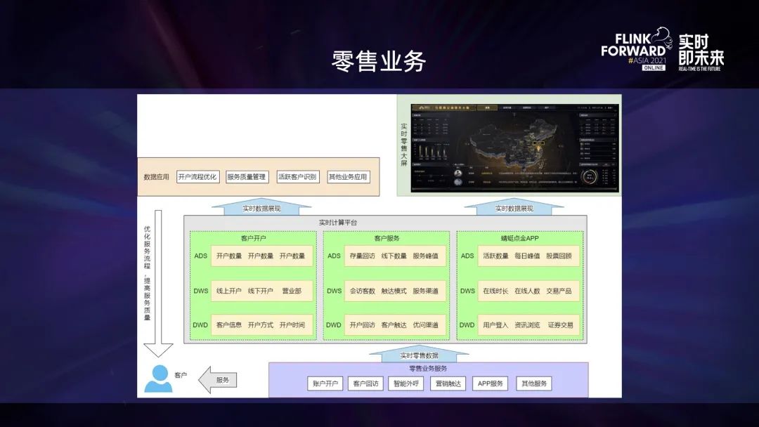 下面以几个实际场景说明 Flink 流处理的应用情况。主要分为三个场景,零售业务实时指标统计、基金投顾实时指标统计和资金流水明细查询。2.1 零售业务场景