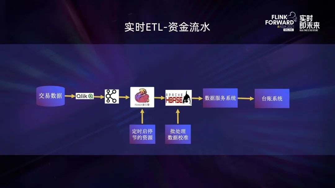 针对数据量小的特点,我们将数据指标结果输出到 Oracle 关系数据库;针对开盘时间将数据供给内部人员查看的特点,我们开启实时任务的启停策略,将更多的资源留给夜间跑批的任务来使用;针对数据准确性要求很高的特点,我们通过夜间离线跑批的方式对数据进行修正,以保证数据的准确性。原来的方案是通过页面触发存储过程来读取数据,而且读取的数据不是源系统数据,存在分钟级别的延迟。而实时数据加工方案通过实时推送客户新增、追加、签约、保有、签约率、规模等维度的指标,让业务部门可以更高效地掌握核心数据。2.3 实时 ETL-资金流水场景