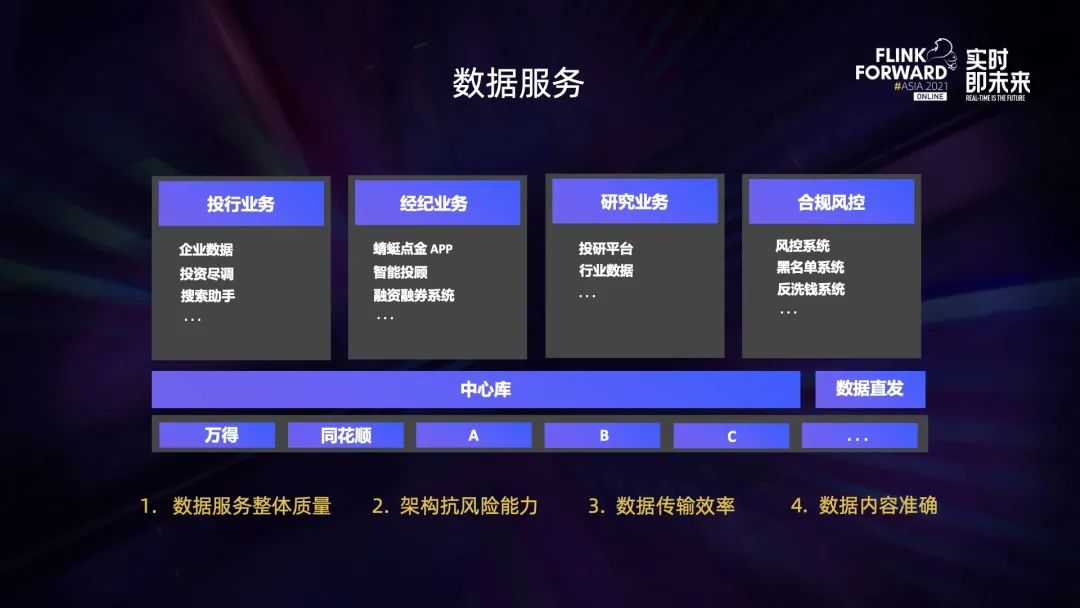 - 第二个特点是金融数据的重要性,大量场景下不允许数据偏差存在,针对数据可靠性要求极高的特征,我们对大量实时任务设置了夜间数据修正的离线任务,保证数据的正确性。