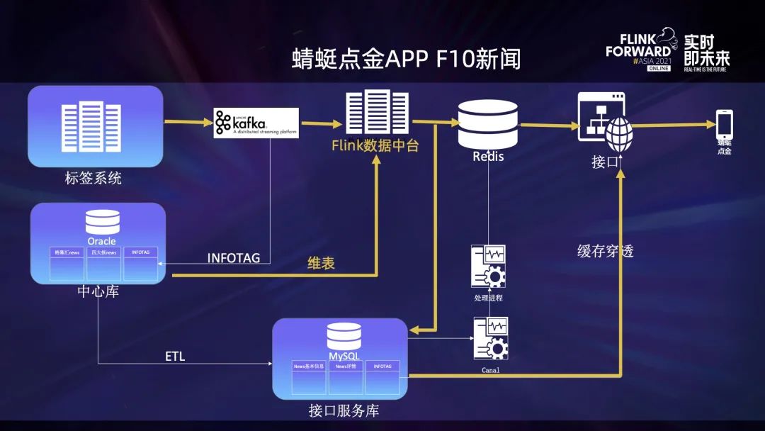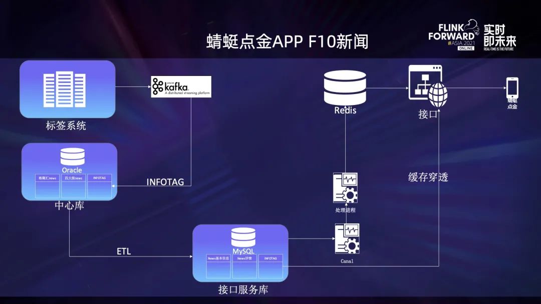 那么品类庞杂的资讯数据具体如何流动?很简单,如图所示的三层结构:最底层是我们引入的数据源,目前大多数资讯数据已经被 Wind、同花顺等资讯数据商收集整理,我们不需要花费太多的时间成本即可获得种种基础数据。但随着引入数据商的增多,问题也随之而来。假设某个数据商出了问题导致合作不能继续,数据服务也必定会受到影响。为了解决这个问题,我们推出了中心库的概念,自建了一套金融数据模型,下游系统都和中心库的数据结构对接,我们负责把资讯数据商屏蔽掉,这就是图中的第二层。上图最右侧还有一个小模块叫数据直发,因为实际应用中并不是所有的下游系统都适合对接,有些依然依赖原始的数据商结构,所以这个小接口依然存在,和中心库并行共同输出数据服务。最上层是服务对象,覆盖了公司内部的各个业务线,持续为各个业务系统输血。在三层的整体架构下,日益增多的数据源还有数据种类提升了我们数据服务的整体质量,有能力服务更多的客户。同时中心库为核心的架构,提高了整体服务的抗风险能力,防范风险是金融公司重中之重的事。我们前期的工作主要集中在这两点上,当这两个功能慢慢完善且稳定后,关注点逐渐转移到资讯数据传输和资讯内容优化上。市场瞬息万变,数据在链路上传播耗时越短,资讯在时间上的价值越高,传输速度没有上限、越快越好,这就是数据传输效率。但是,数据快了而上游数据商的质量参差不齐,服务只快不准,提供给用户的数据存在问题,那么如何在不损失 1、2、3 点的情况下,把控数据内容质量也成了棘手问题。为了优化 3、4 两个点,我们以 Flink 引擎为核心进行了架构改造,选取了两个场景进行分享。3.1 蜻蜓点金 APP F10 新闻场景