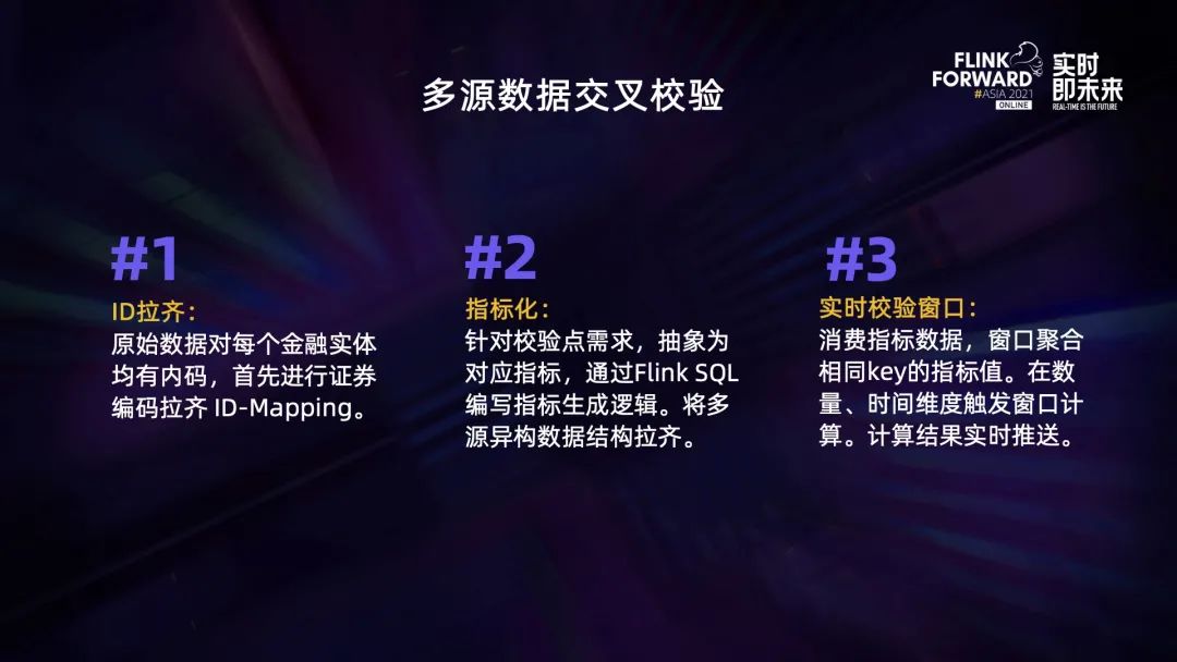 - 第二步是指标化,数据校验的需求往往是具体的,比如校验每日的股票收盘价这种。但是数据商针对校验点的数据结构往往差异较大,因此通过指标化,利用 Flink SQL 编写针对多源库的指标生成逻辑,将异构的数据结构拉齐。