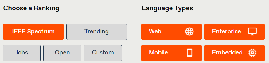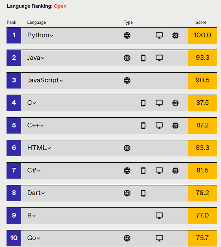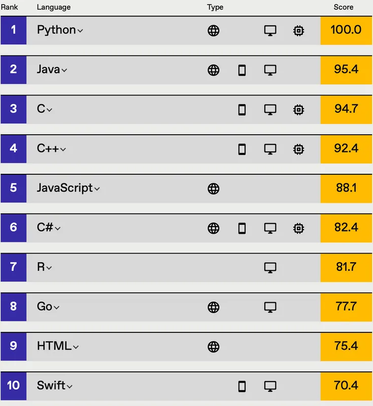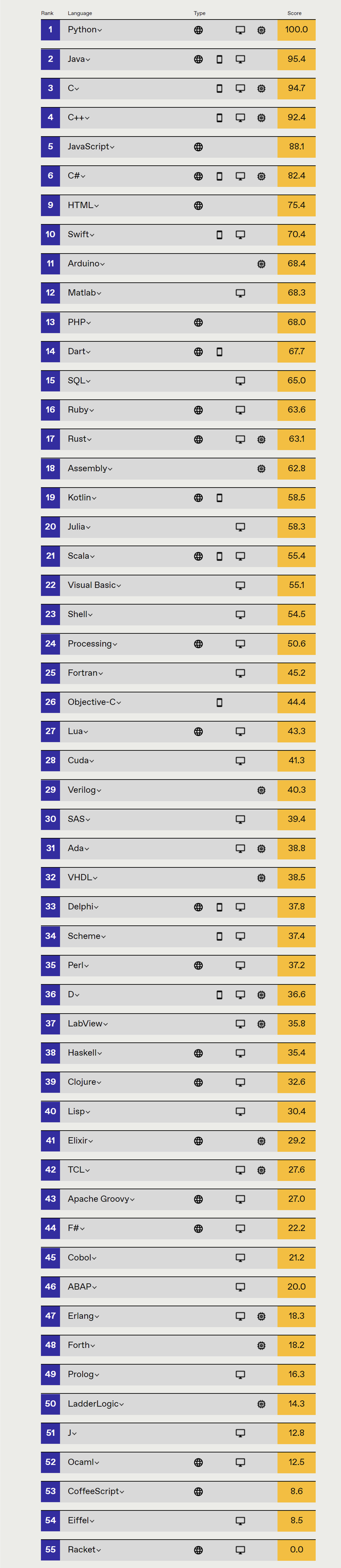2021 年度编程语言排行榜依然从 8 个信息源按照 11 种指标收集数据,最终得到了数十种编程语言流行度的整体排名。这 8 个信息源分别为 CareerBuilder、GitHub、Google、Hacker News、IEEE、Reddit、Stack Overflow 和 Twitter,涵盖了涵盖社交网站、开源代码网站和求职网站。IEEE 2021 编程语言排行榜依然涵盖 4 种不同类型的编程语言,分别是用于开发网站和应用的语言(Web)、用于企业、桌面和科学应用的语言(Enterprise)、用于移动设备端的语言(Mobile)以及用于嵌入式环境的语言(Embedded)。排名类型分为整体排名、趋势排名(Trending)、工作(Jobs)、开源(Open)和自定义(Custom)五种。IEEE 2021 编程语言排行榜的具体情况如下。Top 10 编程语言:Python 五连冠、微软 C# 语言排名飞升与 2020 年排行榜相比,Python、Java、C、C++ 和 JavaScript 依然占据 2021 排行榜的前 5 名。但是,6 至 10 名的编程语言发生了很大变化。Arduino 和 Matlab 跌出了前 10,微软 C# 语言从 2020 年的第 23 名跃升至了第 6 名,HTML 语言也进入了前 10。看完了整体榜单,我们再来看其他排名类型下的编程语言排行。在趋势排名中,Python 仍以绝对优势展示其强劲的发展势头,其余依次为 Java、C、JavaScript、C++、Go、R、HTML 以及 C# 和 SQL。其中,2020 年趋势排行榜前 10 名中的 Arduino、Dart 和 Swift 被 R、C# 和 SQL 所取代。工作环境中需求最大的语言仍是 Python,C 语言排名第二,其次是 Java、JavaScript 和 C++。2020 年排名前 10 中的 Swift 语言被 C# 所取代。在开源项目最受欢迎的编程语言排行中,Python 依然位列第一。2020 年排名前 10 中的 Arduino 被 C# 所取代。微软 C# 语言创建于 2000 年,旨在成为 C++ 语言的轻量级替代,为微软 NET 框架编写基础库。自创建以来,C# 语言便成为了最受欢迎的编程语言之一。在 Windows 生态系统中,C# 语言很快赢得了开发者的青睐,并成为了创建商业应用的主要编程语言,几乎取代了用于 web 后端的 C++ 和 Visual Basic。对于开发者来说,C# 语言学习起来比较容易,具有强大的编程性能,并且在微软 Visual Studio 开发工具的助力下可以愉悦地编写代码。IEEE 2021 编程语言排行榜中,C# 从 2020 年的第 25 名跃升至了第 6 名。这大概得益于微软 2020 年 11 月发布的 C# 9.0 版本以及即将推出的 Windows 11。此外,开发者对分布式系统的兴趣持续增长,而 C# 正是为实现这一功能而设计的,这也是其成为大势语言的原因之一。https://spectrum.ieee.org/top-programming-languages-2021