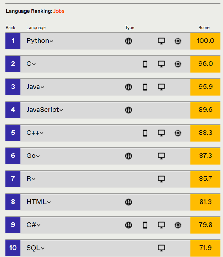 IEEE Spectrum 发布了 2021 年度编程语言排行榜,其中 Python 在总榜单以及其他几个分榜单中依然牢牢占据第一名的位置。另外值得关注的是微软 C# 语言,它的排行从 2020 年的第 23 名跃升至了今年的第 6 名,称得上是今年的大势语言。