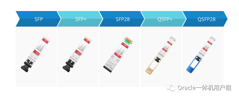 在不同型号的Oracle Exadata一体机中,可能会使用不同型号的光模块,选择合适的光模块对于网络传输非常重要。常用的型号为SFP、SFP+、SFP28、QSFP+和QSFP28。在光纤连接的世界里面,他们使用非常普遍。下面将介绍下如何选择上述5种光模块以及它们的区别