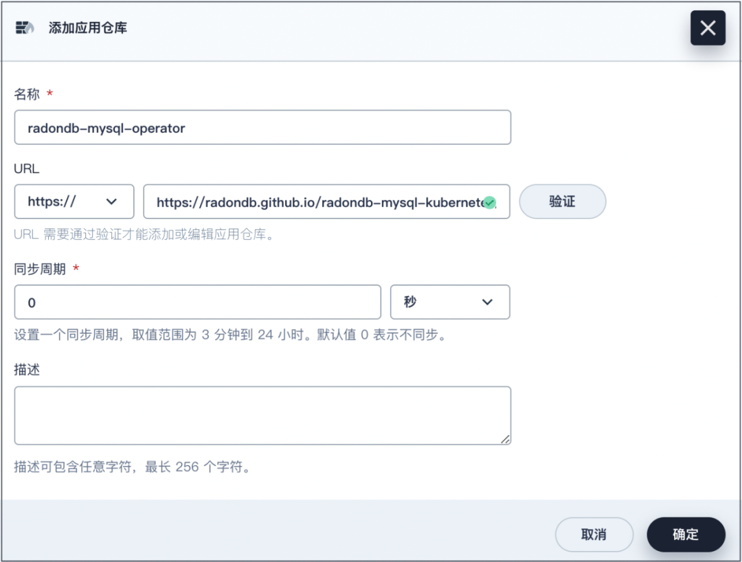 作为应用仓库名称。输入 https://radondb.github.io/radondb-mysql-kubernetes/