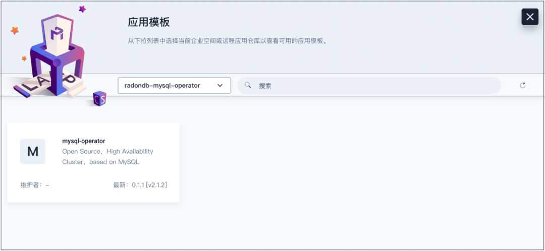 项目中,进入应用负载下的应用页面,点击部署新应用。在对话框中,选择来自应用模板,进入应用模版页面。 从下拉菜单中选择 radondb-mysql-operator