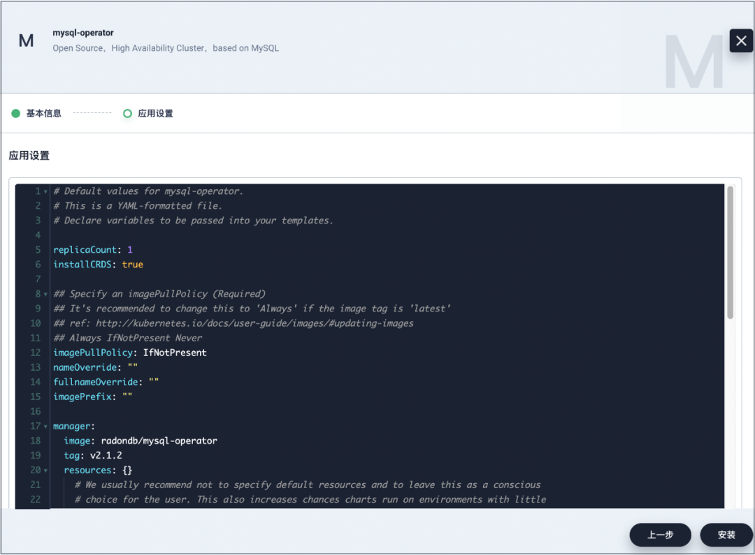 应用基本信息配置页面,确认应用名称、应用版本以及配置部署位置。点击下一步,进入 mysql-operator