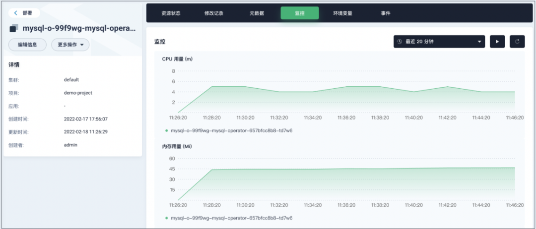 进入 应用负载 下的 工作负载 页面,点击 有状态副本集,可查看集群状态。进入一个 有状态副本集 详情页面,点击 监控 标签页,可查看一定时间范围内的集群指标。