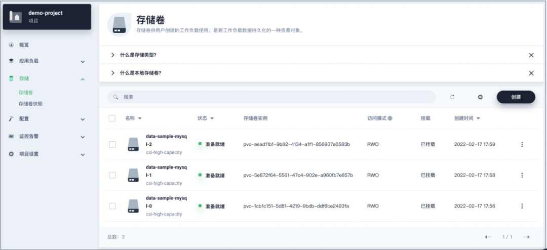 进入 存储 下的 存储卷 页面,可查看存储卷。查看某个存储卷用量信息,以其中一个数据节点为例,可以看到当前存储的存储容量和剩余容量等监控数据。