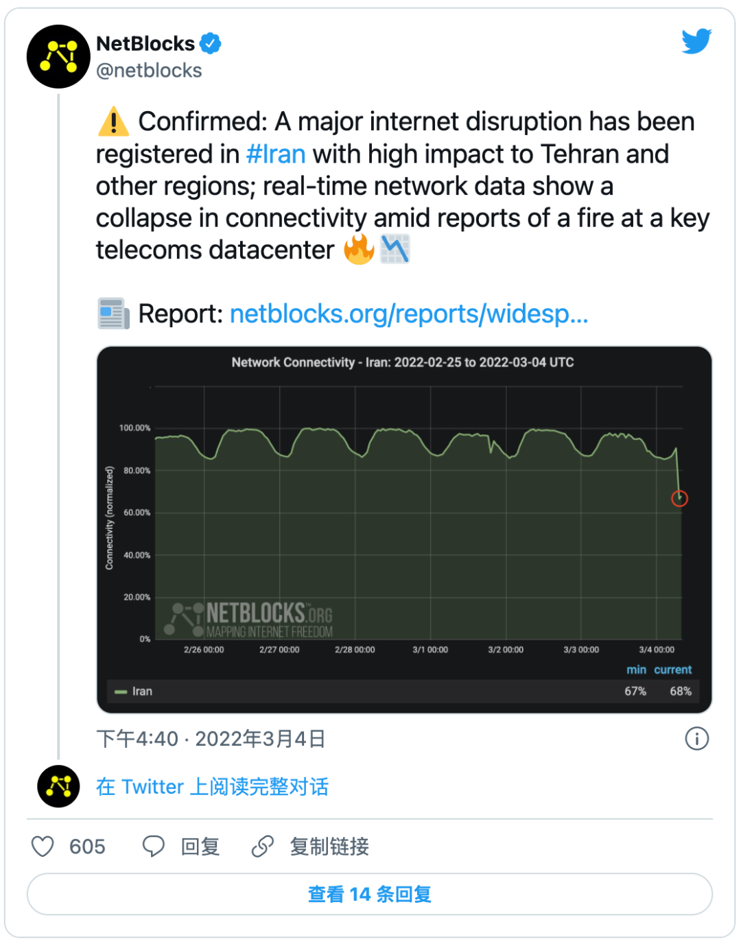 2022年3月4日,一场数据中心火灾导致伊朗全境的互联网中断约三个小时。这起火灾发生在属于电信基础设施公司(TIC)的一栋大楼内,该公司是伊朗境内唯一为该国互联网服务提供商(ISP)提供连接的经销商。TIC使用内容过滤器系统,以便ISP收到的信息流经过了清理。据Netblocks网站声称,集中式网关“让伊朗当局可以控制信息流,以遏制网络威胁,但也因其用于限制民众访问信息和国际服务的用途而受到密切审查。”TIC首席执行官Hamid Fattahi在当地媒体上证实了火灾和故障(主要发生在德黑兰和卡拉季),该公司的官网上转发了媒体报道。官网上之前的一篇帖子称:“该数据中心的电气系统出现了中断”,因而“导致UPS系统和电气系统着火”。Fattahi表示,这起事件在伊朗的一些地区造成了国内服务中断;在一些情况下,国际互联网接入也受到了影响。