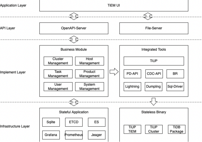 最上层是TiEM UI,可视化界面,通过OpenAPI-Server,和File-Server来获取数据,而中间Business Model 也就是实现TiEM管理层面,将下层的基础设施,进行统一封装和管理,当然这里面也包括自身的管理,例如用户,主机,集群的管理等等。TiEM同时也会封装TiUP的所有操作,可以简单理解成将TiUP操作可视化,而TiUP那一套这里也不做赘述了。