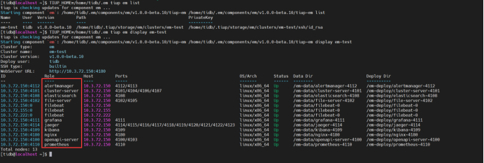 目前TiEM集群一共包含AlterManager,Cluster-Server,Elasticsearch,File-Server,Filebeat,OpenAPI-Server,Jaeger,Kibana,Nginx,Grafana和 Prometheus等11个组件,看名字都是非常眼熟的一些组件。