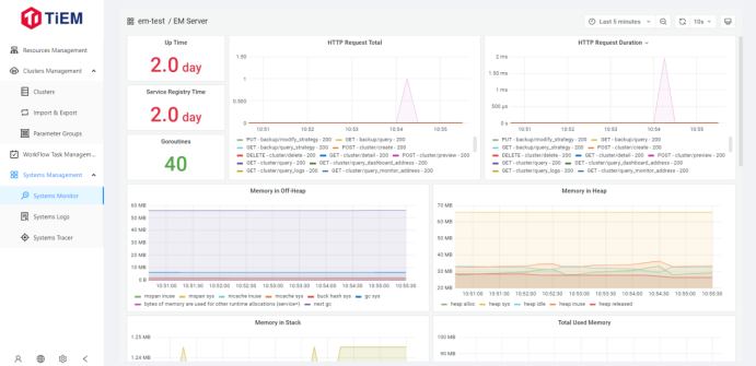 很直观就能看到,有三个子页面,System Monitor,Systems Logs 和 System Tracer。用户可以通过系统监控,日志分析和调用链路追踪三个维度去查看整个 TiEM 系统目前的运行状态,基本是全方位的工具都用上了。如果 TiEM 系统层面出现任何问题,通过这些来进行排查会非常的方便。