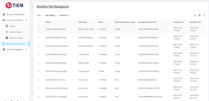 在这个页面,会将所有的工作流进行记录,所谓工作流,就是我们在 TiEM 里面的操作任务,例如导入物理机,创建集群,删除集群等等都会作为一个工作流去执行。所以我们在这个页面能够知道历史的操作记录,还有每个任务的执行详情,是否成功。如果有任务失败了,可以点进去查看任务运行的每一步,具体是到哪一步的时候失败的,方便于我们进行问题排查。