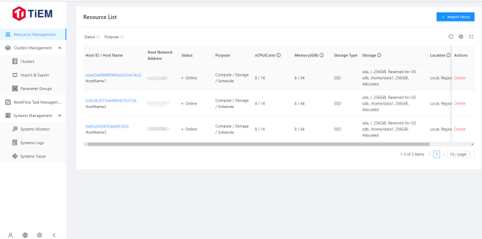 主机资源管理,用于所有的虚拟机和物理机管理,可以视作为资源池。通过导入功能,将现有的机器资源导入到资源池中,那么后面在一键部署TiDB集群的时候,会通过现有的资源池中,选择合适的机器用于部署相应的节点。