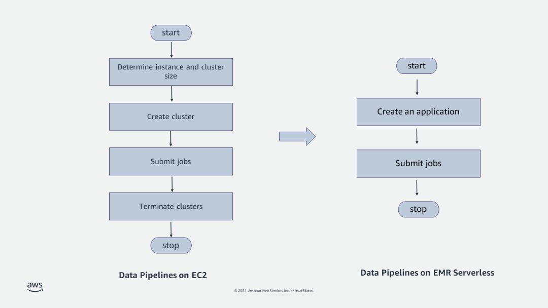 尽管自动执行这些步骤并不复杂,但数据工程师必须花时间确定合适的 spot 实例和集群大小。他们必须确定运行集群的可用区,并处理故障转移。他们在采用操作系统更新时,必须测试其应用程序。当数据大小随时间变化时,他们必须调整集群的大小,或使用诸如 Amazon EMR 托管扩缩之类的功能来自动调整集群大小。Amazon EMR Serverless 提供了更简单的解决方案,让您无需处理这些场景。您只需为应用程序选择开源框架和版本,然后提交作业即可。您不必担心实例选择、集群大小、集群启动、集群大小调整、停止节点、可用区故障转移或操作系统更新等问题。