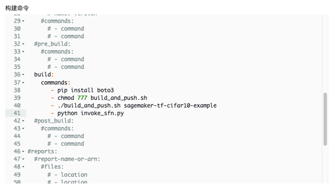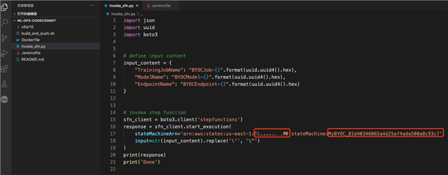 在cifar10文件夹中包含了使用tensorflow对cifar-10数据集进行训练与创建tersorflow serving的代码,会通过Dockerfile文件与build_and_push.sh打包封装成docker image并上传到ECR当中,上传完成后会执行invoke_sfn.py脚本,运行已经定义好的Amazon Step Functions状态机,从而完成Amazon SageMaker训练与部署的过程。