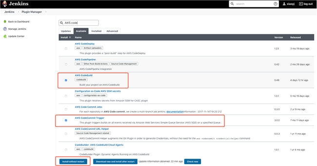 (2)搜索Amazon CodeCommit Trigger与Amazon CodeBuild插件并安装,安装完成之后点击restart;