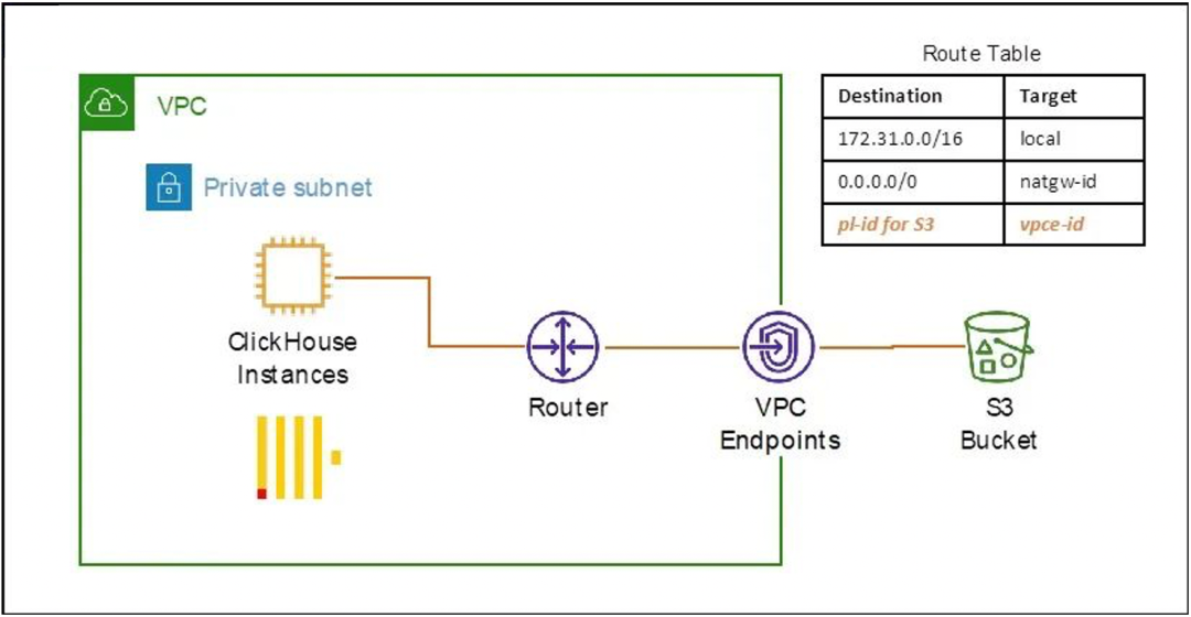 接下来,我们将演示如何实现上述介绍的ClickHouse与S3结合的三种方法。演示的参考架构如下图所示,我们将ClickHouse环境部署在一个VPC私有子网中,然后通过VPC Enpoints内网的方式来访问S3中的数据。