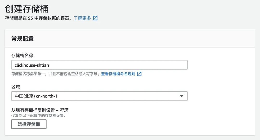 首先,在亚马逊云科技中国(北京)区域创建存储数据的S3存储桶,例如clickhouse-shtian。