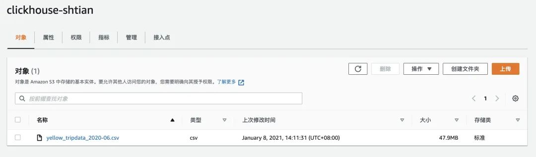 需要注意的是,插入数据在这种情况下也是支持的,但是如果表是使用单文件定义的(如本示例),那么插入会覆盖当前文件的内容。如果是使用通配符的方式进行定义(如*.CSV),在插入数据的时候会写到*.CSV,目前已经将问题反馈提交到ClickHouse开源社区。因此,建议目前使用这种方法时,只去查询S3中的数据。