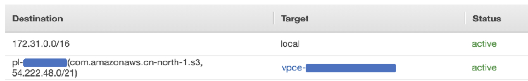 VPC Enpoint的创建和配置请参考VPC文档,确保子网路由表中包含下图中第二条路有条目。