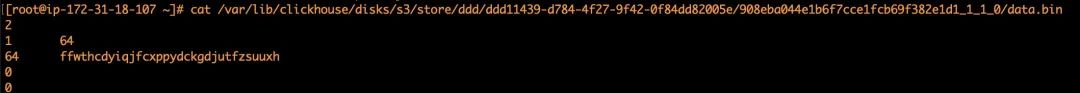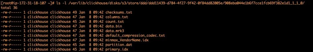 可以看到ClickHouse中磁盘上保留了ClickHouse中数据存储结构,包括数据bin文件、分区信息、索引等内容。