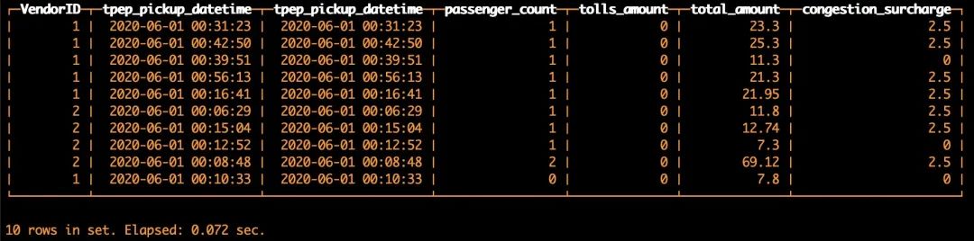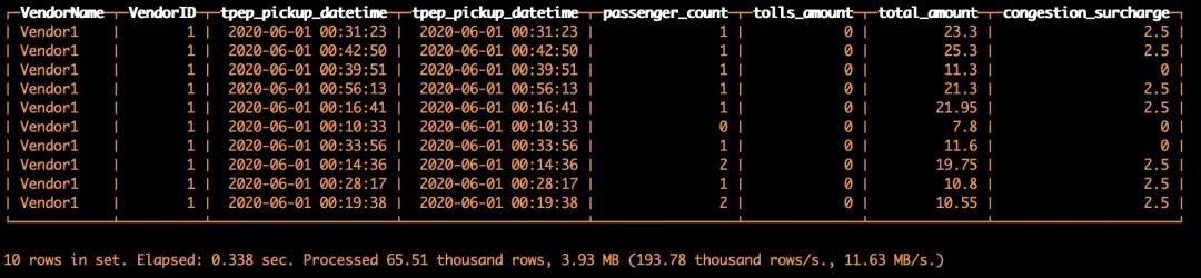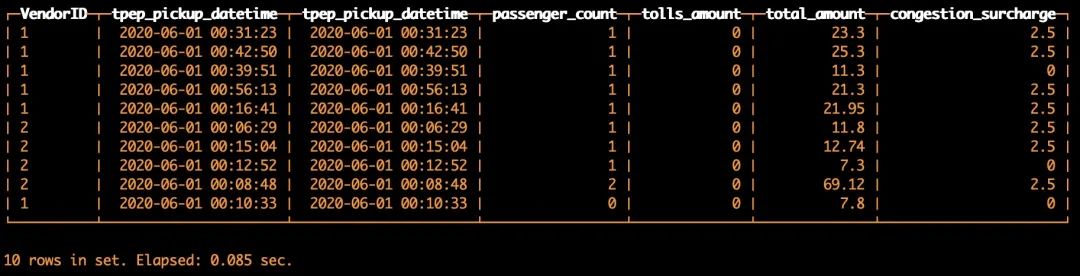 FROM s3('https://s3.cn-north-1.amazonaws.com.cn/clickhouse-shtian/yellow_tripdata_2020-06.csv', CSVWithNames, 'VendorID UInt8,tpep_pickup_datetime DateTime,tpep_dropoff_datetime DateTime,passenger_count UInt8,trip_distance Float32,RatecodeID UInt8,store_and_fwd_flag String,PULocationID UInt8,DOLocationID UInt8,payment_type UInt8,fare_amount Float32,extra Float32,mta_tax Float32,tip_amount Float32,tolls_amount Float32,improvement_surcharge Float32,total_amount Float32,congestion_surcharge Float32')