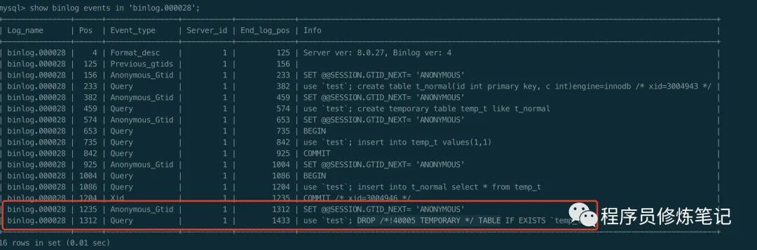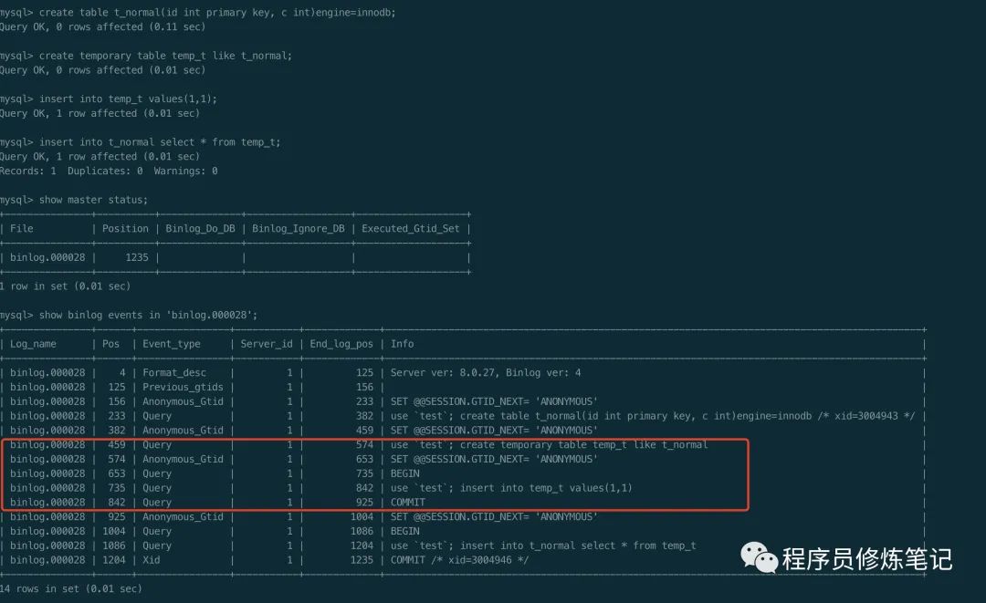 如果binlog的格式是ROW模式,上述关于临时表的日志不会写入binlog,因为ROW模式下记录insert into t_normal时记录的是这个操作的数据,因此临时表的相关日志可以不写入binlog。