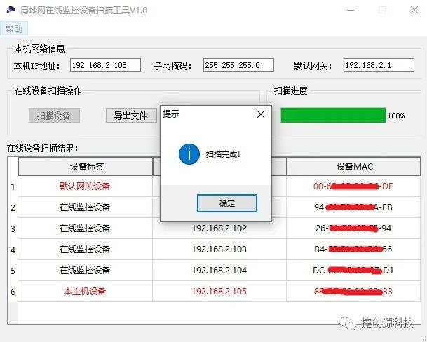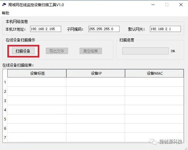 4. 单击“扫描设备”按钮,开始扫描局域网监控设备IP 和MAC 地址。