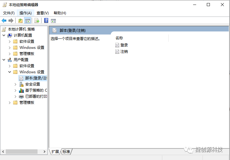 逐级打开“本地计算机策略”–>“用户配置”–>“Windows设置”–>“脚本(登录/注销)”