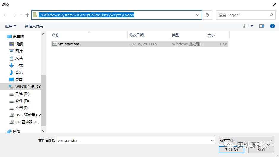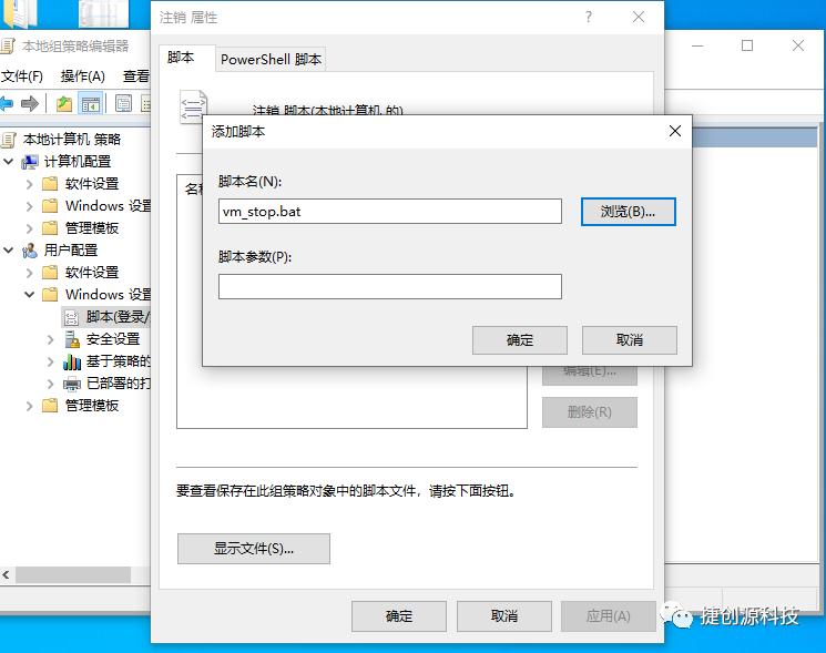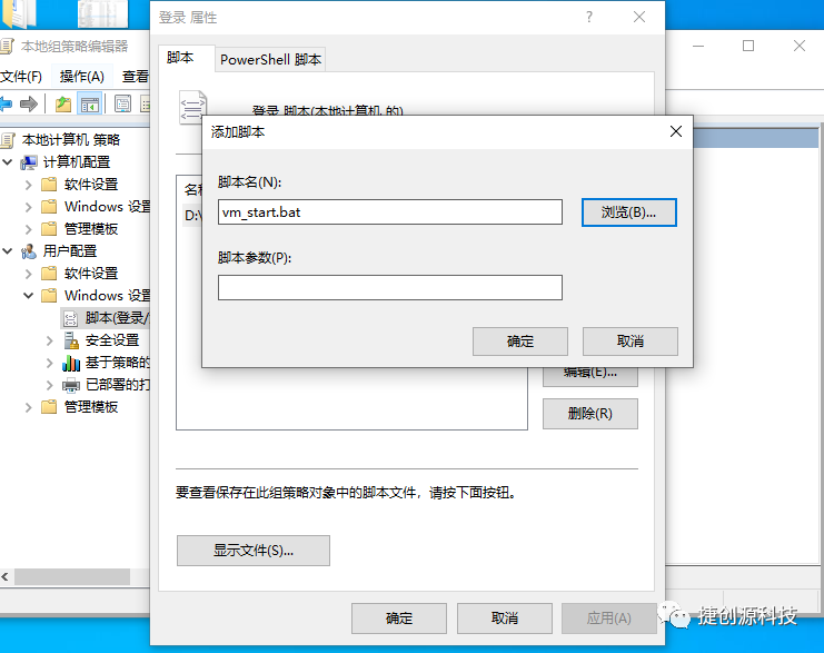 2.双击登录,点击添加,浏览,会弹出浏览对话框,把vm_start.bat文件复制到这个位置即可,再次选择这个bat文件,(最后应用或确定,此项是开机登录后自动启动vm的操作)。