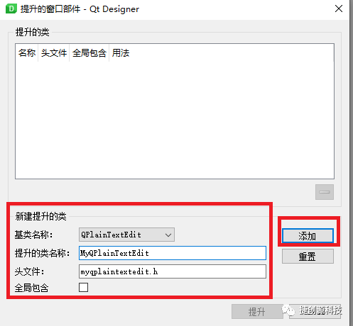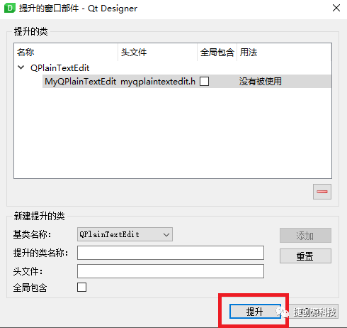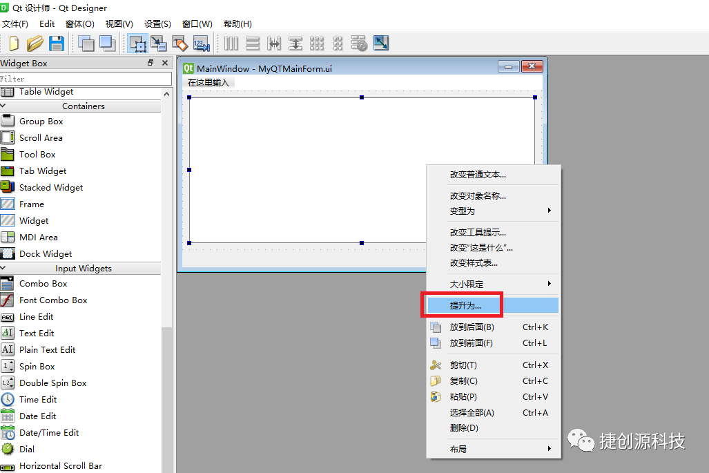 三、使用QT设计器打开主窗口MyQTMainForm.ui 文件,将QPlainTextEdit 提升为MyQPlainTextEdit 类,如下图示: